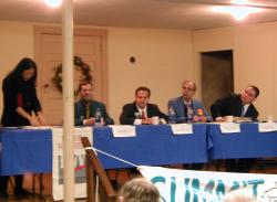 State Senate candidates Rhoda Perry, the incumbant, and her opponent Leo Trevino joined State Representative incumbant Gordon Fox, his Republican challenger Charles Smith and Libertarian candidate Jonathon Wiening. Together the five answered questions about the PILOT (Payment in Lieu of Taxes) program, support for Channel 36, balancing the state budget, RIte Care and the Bond Issues.