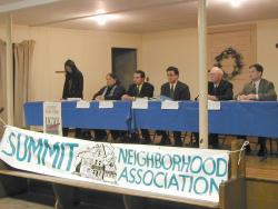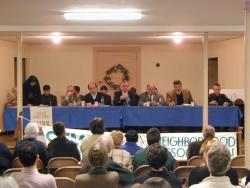 State Senate candidates Rhoda Perry, the incumbant, and her opponent Leo Trevino joined State Representative incumbant Gordon Fox, his Republican challenger Charles Smith and Libertarian candidate Jonathon Wiening. Together the five answered questions about the PILOT (Payment in Lieu of Taxes) program, support for Channel 36, balancing the state budget, RIte Care and the Bond Issues.